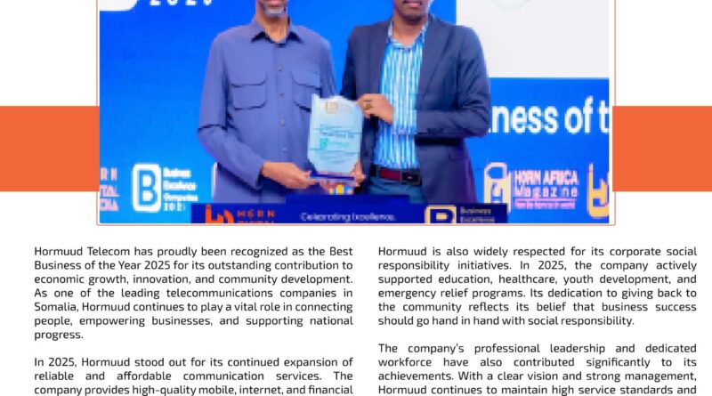 Hormuud Telecom has proudly been recognized as the Best Business of the Year 2025 for its outstanding contribution to economic